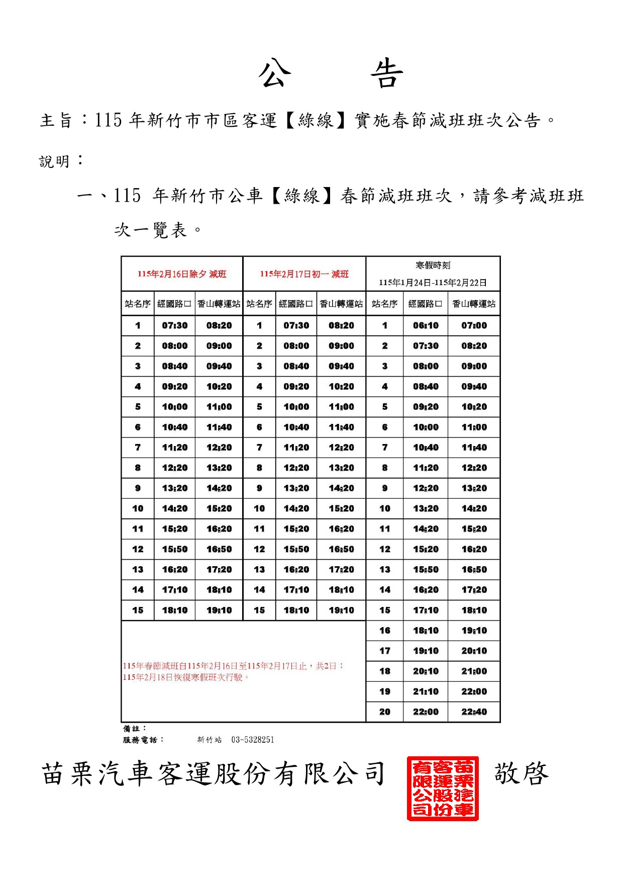 115年度【新竹市區公車綠線】春節調整班次時刻公告
