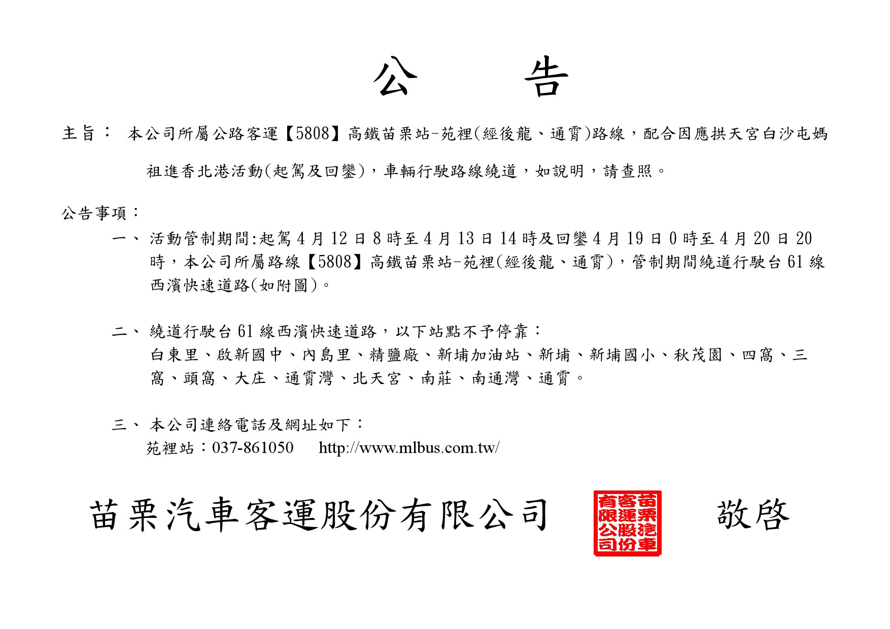 配合白沙屯媽祖進香活動5808路線改道行駛