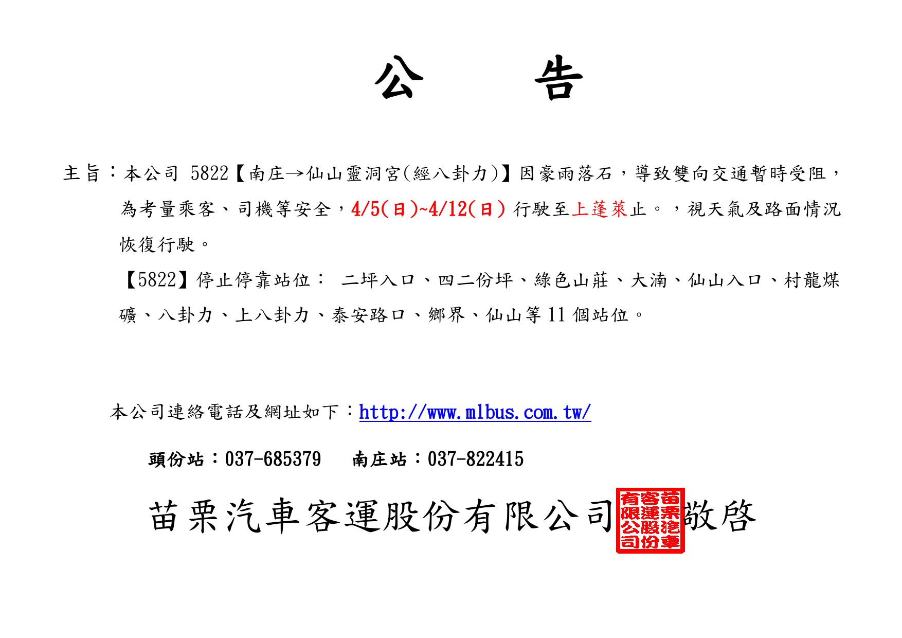 受豪雨落石影響5822路線行駛至上蓬萊止