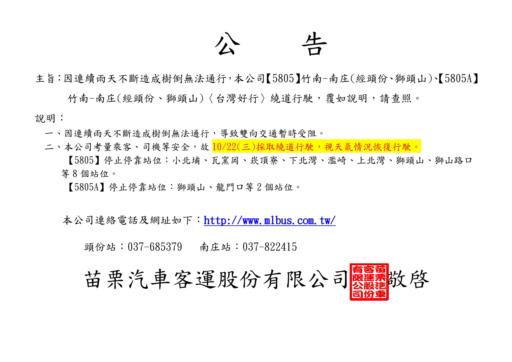 【5805】、【5805A】因樹倒無法通行,故繞道行駛