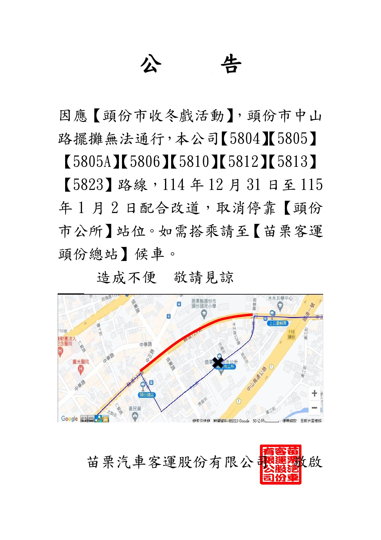 「2024頭份收冬戲」班車改道公告