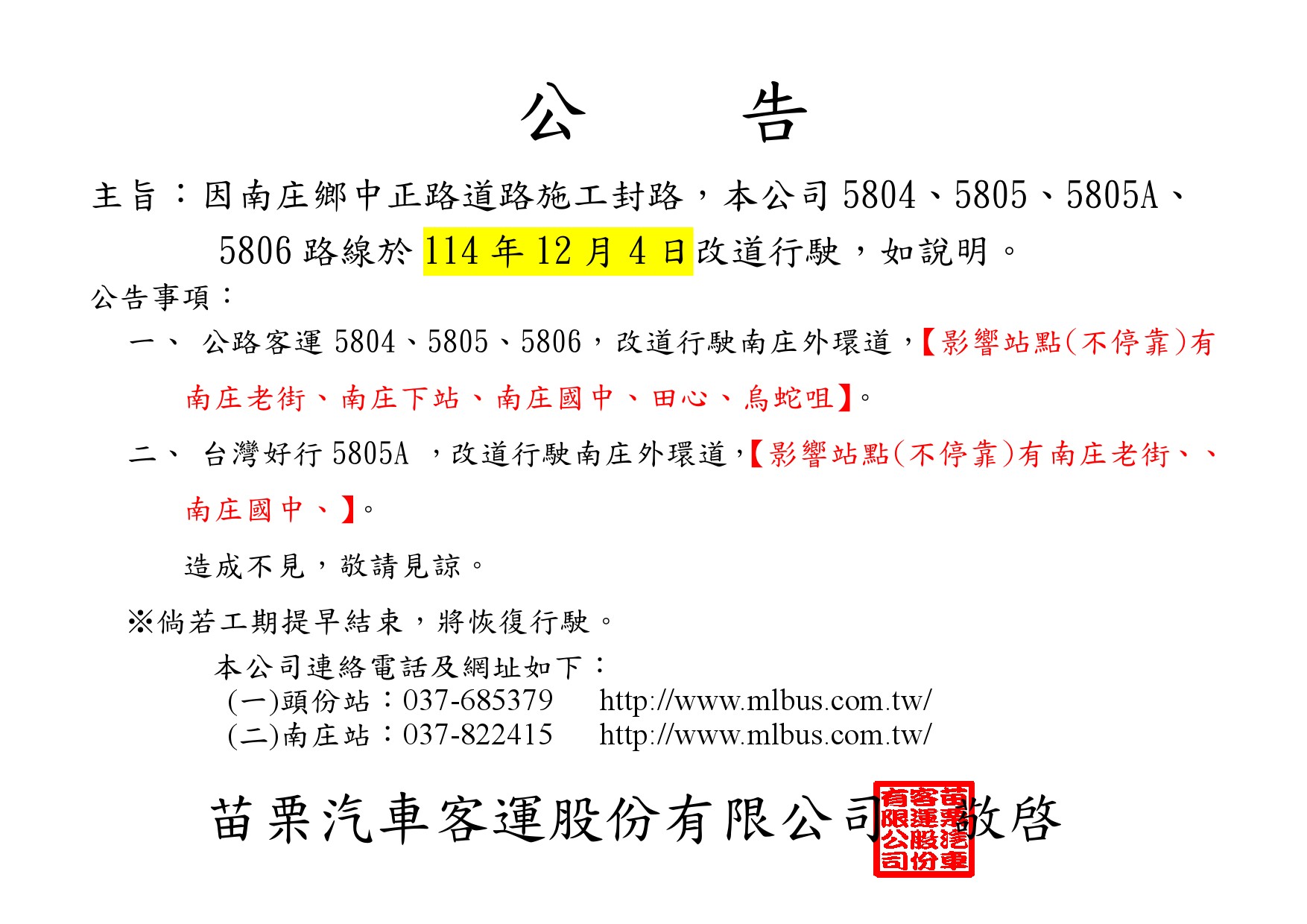 因南庄鄉中正路道路施工封路,於114年12月4日改道行駛